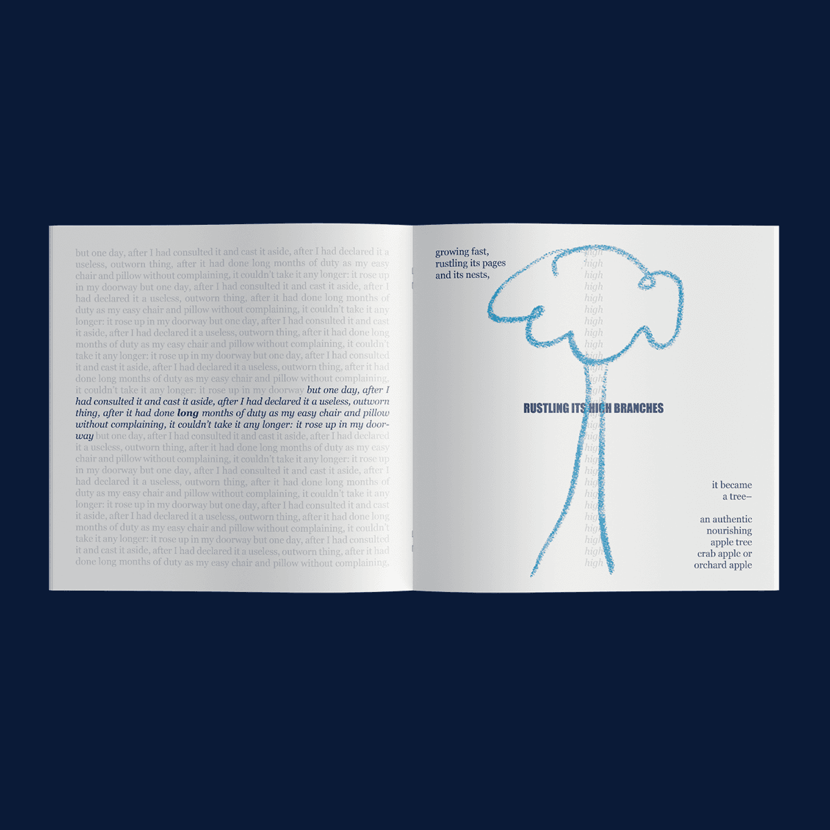 In conjunction with the typography, the unrefined or non-textual imagery was loosely drawn from the dictionary pages I scribbled on as a child. The crayon-like strokes and the sketch-like style served to create a strong sense of childlike playfulness, thus infantilizing the dictionary as an object of childlike understanding. To further strip the dictionary away from its highly academic associations, I restricted myself from metaphorically interpreting or dissecting the poem in the drawings. Instead, I wanted the drawings to be a more direct or literal interpretation of the poem, taking each line and word for what they are.