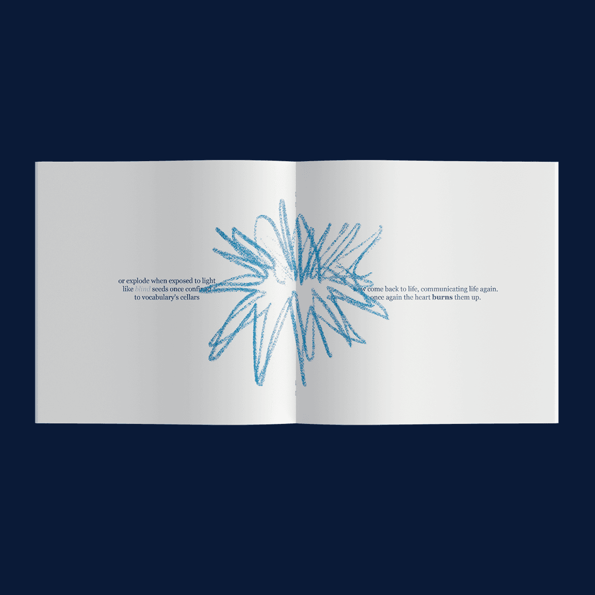 The typography is playful, deliberately shifting between various weights, styles, and colors to bring life and meaning to the words that build the poem. It served as a visual aspect of the book while recognizing text as a significant component of the dictionary. The typefaces included in this project were Impact, a heavy sans-serif font that resembled the cover of my mother’s dictionary, and Georgia, a classic serif font that can be found on most dictionary pages.